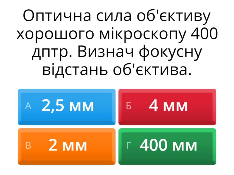 1) Оптична сила об'єктиву хорошого мікроскопу 400 дптр. Визнач фокусну відстань об'єктива. a) 2,5 мм b) 4 мм c) 2 мм d) 400 мм 2) Фокусна відстань збиральної лінзи 400 мм. Визнач її оптичну силу. a) 1 дптр b) 2,5 дптр c) 400 дптр d) 2 дптр 3) Предмет розташований на відстані 20 см від тонкої лінзи. Визнач, на якій відстані від лінзи знаходиться зображення предмета, якщо оптична сила лінзи 2,5 дптр. a) -0,2 м b) 0,2 м c) -0,4 м d) 0,4 м 4) Відстань від предмета до розсіювальної лінзи 50 см, а від лінзи до зображення 20 см. Визнач оптичну силу лінзи. a) 3 дптр b) 1,5 дптр c) -1,5 дптр d) -3 дптр