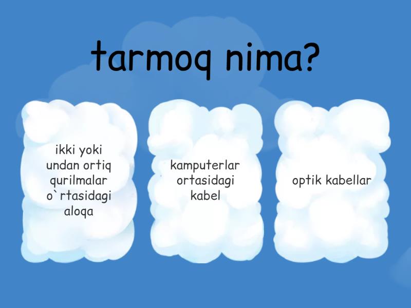 1) tarmoq nima? a) ikki yoki undan ortiq qurilmalar o`rtasidagi aloqa b) kamputerlar ortasidagi kabel c) optik kabellar 2) tarmoq turlari ? a) global va magistral b) magistral va optik c) lokal va global 3) lokal tarmoqda server bormi? a) ha b) yo`q 4) global tarmoq qisqarmasi? a) LAN b) MAN c) WAN 5) lokal tarmoq qisqartmasi? a) MAN b) LAN c) WAN 6) mintaqaviy tarmoq qisqartmasi? a) LAN b) MAN c) WAN 7) vpn nima? a) shaxsiy vertual tarmoq b) shaxsiy tarmoq c) shaxsiy ikki kishilik tarmoq 8) server nima? a) foydalanuvchi ehtiyojini bajaruvchi tizim b) foydalanushni boshqaruvchi qism c) asosiy super kamputer (tarmoqsiz) 9) mijoz nima? a) tarmoqdan foydalanuvchi shaxs b) tarmoq operatori c) tarmoqdan foydalanuvchi super server 10) malumot uzatish tezligi qaysida kuchli? a) MAN b) LAN c) WAN