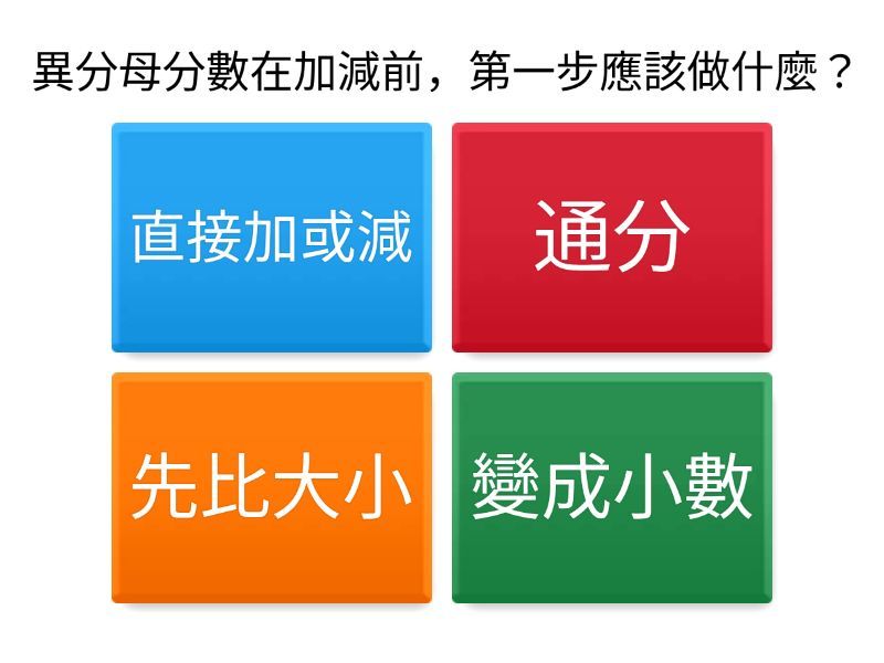 1) 異分母分數在加減前,第一步應該做什麼? a) 直接加或減 b) 通分 c) 先比大小 d) 變成小數 2) 進行通分時,下列哪一個動作是正確的?通分的目的最接近下列哪一句話? a) 分母乘以一個數,分子不變 b) 分子乘以一個數,分母不變 c) 分子與分母都隨便乘 d) 分子與分母同乘以相同的數 3) 通分後再計算時,加減的部分應該怎麼做? a) 分母相加,分子不變 b) 分子相加或相減,分母保持不變 c) 分子分母都相減 d) 分子分母都相加 4) 下列哪一個是「約分」的目的? a) 讓分數值變大 b) 讓分數值變小 c) 讓分數更簡單、方便運算 d) 改變分數的大小 5) 異分母計算時選擇共同分母,以下哪一項最好? a) 兩個分母的最小公倍數 b) 其中較大的那一個分母 c) 隨便選一個數 d) 分子的最大公因數