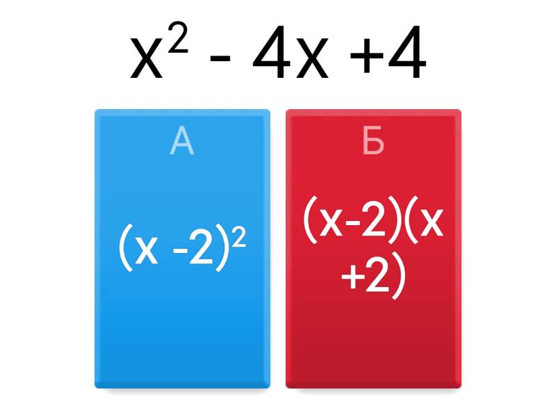 1) х2 - 4х +4 a) (х -2)2 b) (х-2)(х +2) 2) (х+3)2 a) х2 + 9 b) х2 + 6х + 9 3) (х +3)(3- х) a) х2 - 9 b) 9 - х2 4) х2 - 100 a) (х - 10)2 b) (х-10)(х + 10) 5) х2 - 2х + 1 a) (х - 1)2 b) (х -1)(х + 1) 6) (3х + 2у)2 a) 9х2 +12ху +4у2 b) 9х2 + 4у2 7) (а+у)2 a) а2 + у2 b) а2 + 2ау + у2 8) (х -2)2 a) х2 - 4х +4 b) х2 - 4 9) (у -5)2 a) у2 -5у +25 b) у2 - 10у + 25 10) у2 - 81 a) (9 - у)(9 + у) b) (у - 9)(у + 9)