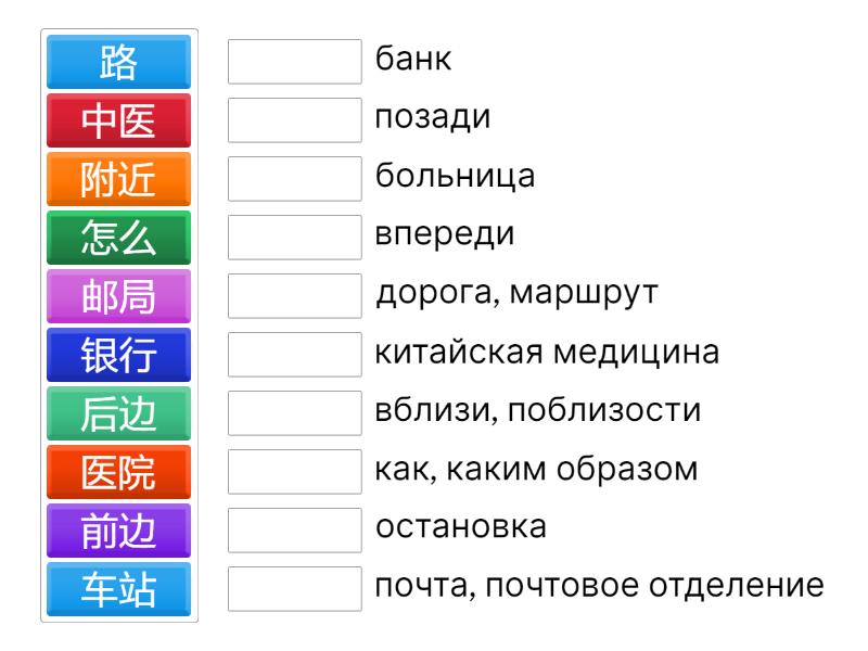 路 - дорога, маршрут, 车站 - остановка, 怎么 - как, каким образом, 附近 - вблизи, поблизости, 邮局 - почта, почтовое отделение, 前边 - впереди, 银行 - банк, 后边 - позади, 中医 - китайская медицина, 医院 - больница,