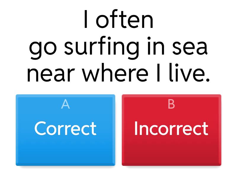 1) I often go surfing in sea near where I live. a) Correct b) Incorrect 2) He's the Londoner, but he lives in countryside now. a) Correct b) Incorrect 3) Our summer courses are popular with the students and the business people. a) Correct b) Incorrect 4) People come from all over the world to visit this statue. a) Correct b) Incorrect 5) Our summers course are popular with students and business people. a) Correct b) Incorrect 6) There is a lively pedestrian street in the city centre. a) Correct b) Incorrect 7) My favourite landmark in Paris is Eiffel Tower. a) Correct b) Incorrect 8) Is the match at the old stadium on Lake Street or the new one?  a) Correct b) Incorrect 9) He' a Londoner, but he lives in the countryside now. a) Correct b) Incorrect 10) I'm an architect and I work in an office. a) Correct b) Incorrect 11) There is a great outdoor cafe in the town square. a) Correct b) Incorrect 12) The people come from all over the world to visit this statue. a) Correct b) Incorrect 13) My favourite landmark in Paris is the Eiffel Tower. a) Correct b) Incorrect 14) The price of sugar and coffee has gone up in the last year. a) Correct b) Incorrect 15) Is the match at an old stadium on Lake Street or a new one? a) Correct b) Incorrect 16) I'm the architect and I work in the office. a) Correct b) Incorrect 17) I often go surfing in the sea near where I live. a) Correct b) Incorrect 18) There is lively pedestrian street in the city centre. a) Correct b) Incorrect 19) The price of the sugar and the coffee has gone up in the last year. a) Correct b) Incorrect 20) There is the great outdoor cafe in a town square. a) Correct b) Incorrect