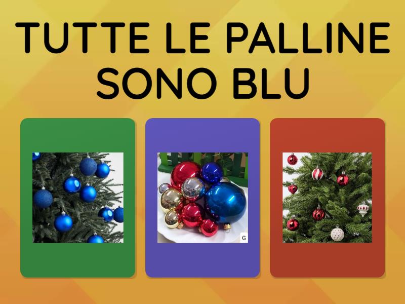 1) TUTTE LE PALLINE SONO BLU a) b) c) 2) NESSUN FIORE E' GIALLO a) b) c) 3) ALCUNI TULIPANI SONO ROSA a) b) c) 4) QUALCHE BAMBINO E' BIONDO a) b) c) 5) QUALCHE PESCE E' A RIGHE a) b) c) 6) SOLO UN PULCINO E' GIALLO a) b) c) 7) NESSUNA PALLINA E' BLU a) b) c) 8) ALCUNI FIORI SONO GIALLI a) b) c) 9) NESSUNA MEDUSA E' ROSA a) b) c) 10) TUTTE LE MEDUSE SONO ROSA a) b) c) 11) OGNI GATTO E' NERO a) b) c) 12) OGNI CUSCINO HA LE RIGHE a) b) c) 13) SOLTANTO UN CUSCINO HA LE RIGHE a) b) c) 14) QUALCHE BICI E' GIALLA a) b) c)