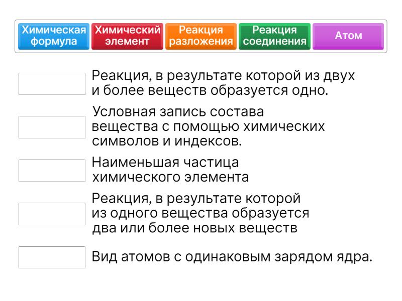 Атом - Наименьшая частица химического элемента, Химический элемент - Вид атомов с одинаковым зарядом ядра., Химическая формула - Условная запись состава вещества с помощью химических символов и индексов., Реакция соединения - Реакция, в результате которой из двух и более веществ образуется одно., Реакция разложения - Реакция, в результате которой из одного вещества образуется два или более новых веществ,