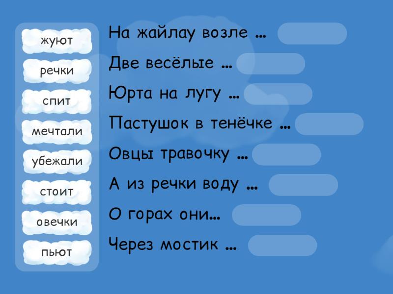 На жайлау возле ... ____ Две весёлые ...____ Юрта на лугу ...____ Пастушок в тенёчке ...____ Овцы травочку ...____ А из речки воду ... ____ О горах они... ____ Через мостик ... ____