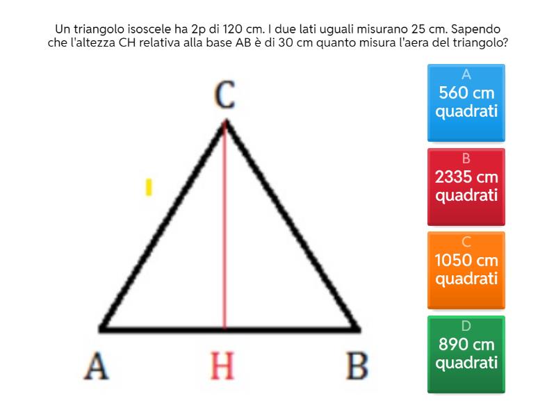1) Un triangolo isoscele ha 2p di 120 cm. I due lati uguali misurano 25 cm. Sapendo che l'altezza CH relativa alla base AB è di 30 cm quanto misura l'aera del triangolo? a) 560 cm quadrati b) 2335 cm quadrati c) 1050 cm quadrati d) 890 cm quadrati 2) Il triangolo ABC ha il lato AB che misura 18 cm e il lato AC che misura 15 cm. Sapendo che l'altezza CH (relativa ad AB) misura 10 cm , l'altezza BK  (relativa a BC ) è di? a) 17 cm b) 23 cm c) 9 cm d) 12 cm 3) Un triangolo rettangolo ha il cateto AB che misura 12 cm, il cateto CA che misura 22 cm e l'ipotenusa BC che misura 33 cm. L'area del triangolo e l'altezza relativa all'ipotenusa BC misurano... a) 132 cm quadrati e 8 cm b) 284 cm quadrati e 34 cm c) 156 cm quadrati e 27 cm d) 85 cm quadrati e 10 cm 4) Calcola l'area di un triangolo la cui base è 5/4 dell'altezza, sapendo che la somma della base e dell'altezza misura 45 cm a) 340 cm quadrati b) 250 cm quadrati c) 170 cm quadrati d) 95 cm quadrati 5) L'area di un triangolo misura 300 cm quadrati. L'altezza AH misura 20 cm, l'altezza BK misura 10 cm, l'altezza CL misura 50 cm. Calcola il perimetro del triangolo a) 140 cm b) 89 cm c) 222 cm d) 326 cm