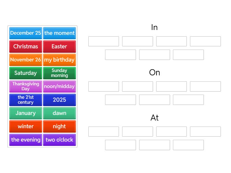 In: January, winter, 2025, the 21st century, the evening, On: November 26, Thanksgiving Day, December 25, Saturday, Sunday morning, my birthday, At: two o'clock, noon/midday, night, dawn, Christmas, Easter, the moment,