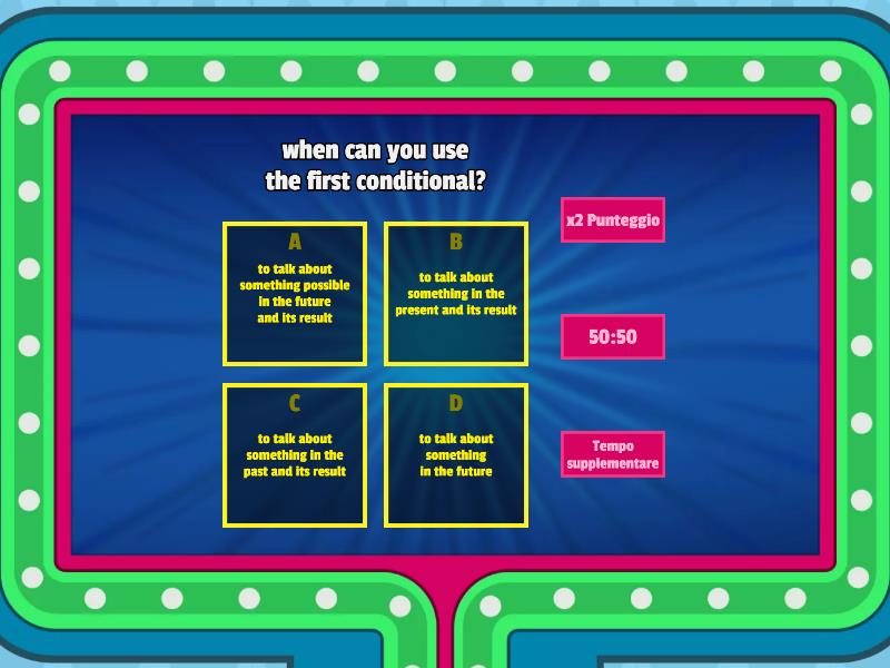 1) when can you use the first conditional? a) to talk about something possible in the future and its result b) to talk about something in the present and its result c) to talk about something in the past and its result d) to talk about something in the future 2) when the result clause comes first, what do we do? a) we add present simple b) we add present continous c) we add a comma d) we don't add the comma 3) which two things are used in the zero conditional a) "will" and "won't" clause b) "if" and "result" clause c) "but" and "can" clause 4) which of these two sentences is zero conditional a) My phone will ring if someone sends me a message b) If someone sends me a message, my phone makes a noise c) My phone can't ring when someone sends me a message