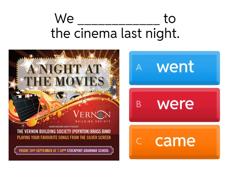 1) We ____________ to the cinema last night. a) went b) were c) came 2) She ____________her leg two weeks ago. a) lost b) broke c) chose 3) They ____________ a wallet on the pavement yesterday afternoon. a) took b) thought c) found 4) My friends and I ______________ at the stadium to see a football match. a) drank b) drove c) met 5) You and Rachel ________________ your books at home. a) forgot b) lost c) threw 6) My grandma _________ very lonely last night. a) saw b) felt c) hit 7) Two years ago we ___________to New York. a) stole b) flew c) held 8) Yesterday________ the best day of my life! a) were b) was c) had 9) Last Monday he ____________ a new car. a) bought b) sang c) read 10) Last summer we __________ a lot of fun at the seaside. a) Got b) Had c) Were 11) Ralph _____________ the competition very easily. a) cut b) hung c) won 12) _______ she _____________ a new dress yesterday afternoon? a) Did_________bought b) Does________buy c) Did _________buy 13) My parents ____________________ for Paris two weeks ago. a) Didn't leave b) Not left c) Don't leave 14) She ___________early last Sunday, so she _______________ to the seaside with her friends. a) Doesn't get up/ can't go b) Don't get up/ couldn't go c) Didn't get up/ couldn't go 15) When _________you _________ your car keys? I ________ them last week. a) Did_____lose/ lost b) Have you lose/ lose c) Do you lost/ losted 16) Last night he ___________ the fridge and ___________ a bottle of milk. a) Opens / takes b) Opened / took c) Opened / taked 17) In 1492 Christopher Columbus ________________ America. a) Discovered b) Arrived c) Left 18) Last Summer my friends and I ______________ on holiday to Mexico. a) Arrived b) Started c) Went