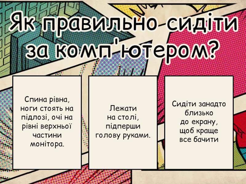 1) Як правильно сидіти за комп'ютером? a) Спина рівна, ноги стоять на підлозі, очі на рівні верхньої частини монітора. b) Лежати на столі, підперши голову руками. c) Сидіти занадто близько до екрану, щоб краще все бачити 2) Для чого потрібні папки на комп'ютері? a) Щоб зробити комп'ютер швидким. b) Щоб змінити колір екрану. c) Щоб зберегти файли в порядку. 3) Що не можна робити під час роботи за комп'ютером? a) Сидіти рівно та слідкувати за поставою b) Робити перерви кожні 15-20 хвилин c) Пити чай чи воду біля комп'ютера 4) Як створити нову комп'ютерну папку? a) Відкрити браузер, написати «створи папку» та натиснути Enter b) Натиснути правою кнопкою миші на робочому столі → Обрати «Створити» → «Папку» → Ввести назву c) Натиснути клавішу «Caps Lock» і назвати папку голосом 5) Що таке текстовий редактор? a) Це програма для створення, редагування та форматування тексту b) Це програма для малювання та редагування зображення c) Це пристрій для друку тексту на папері 6) Чи ставиться пробіл перед розділовими знаками? a) Пробіл поставитися перед крапкою, комою та знаком оклику, але не перед знаком питання. b) Ні, пробіл перед розділовими знаками не ставитися, а після них — ставиться. c) Так, перед усіма розділовими знаками завжди ставитися пробіл. 7) Що відбувається, коли натискаєш клавішу Enter у текстовому редакторі? a) Текст автоматично зберігається. b) Курсор переноситься на новий рядок. c) Текст стає жирним. 8) Що таке форматування тексту? a) Зміна вигляду тексту (шрифт, розмір, стиль). b) Введення тексту без пробілів між словами. c) Видалення всіх літер з тексту. 9) Чим відрізняються клавіші Backspace і Delete у текстовому редакторі? a) Клавіша Delete вставляє нові символи, а Backspace — їх видаляє. b) Клавіша Backspace видаляє слова, а Delete — абзаци. c) Клавіша Backspace видаляє символ ліворуч від курсору, а клавіша Delete — праворуч. 10) Як можна змінити розмір зображення в текстовому редакторі? a) Клацнути на малюнок і потягнути за один з кутів для зміни розміру. b) Вибрати малюнок і натиснути клавіші Shift і Enter. c) Клацнути правою кнопкою миші на малюнок і вибрати "Видалити". 11) Що таке графічний редактор? a) Програма для написання текстів та документів. b) Програма для створення та редагування малюнків, зображень. c) Програма для прослуховування музики. 12) Що таке алгоритм? a) Програма для редагування тексту. b) Група людей, що працюють разом над проєктом. c) Чітка послідовність дій для виконання певного завдання.