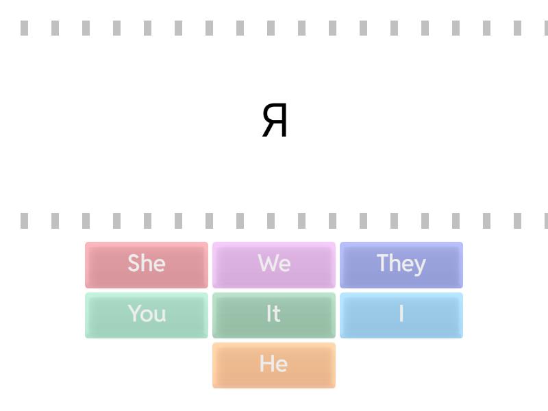 I - Я, She - Она, He - Он, It - Оно, We - Мы, They - Они, You - Вы, ты,