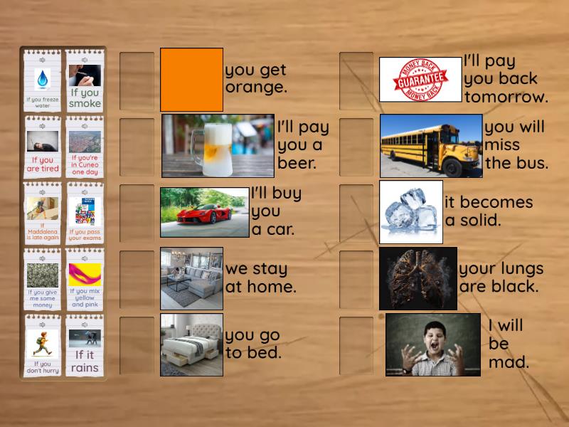 If it rains - we stay at home., If you mix yellow and pink - you get orange., If you smoke  - your lungs are black., If you are tired - you go to bed., If you freeze water - it becomes a solid., If you don't hurry - you will miss the bus., If Maddalena is late again - I will be mad., If you pass your exams - I'll buy you a car., If you give me some money - I'll pay you back tomorrow., If you're in Cuneo one day  - I'll pay you a beer.,