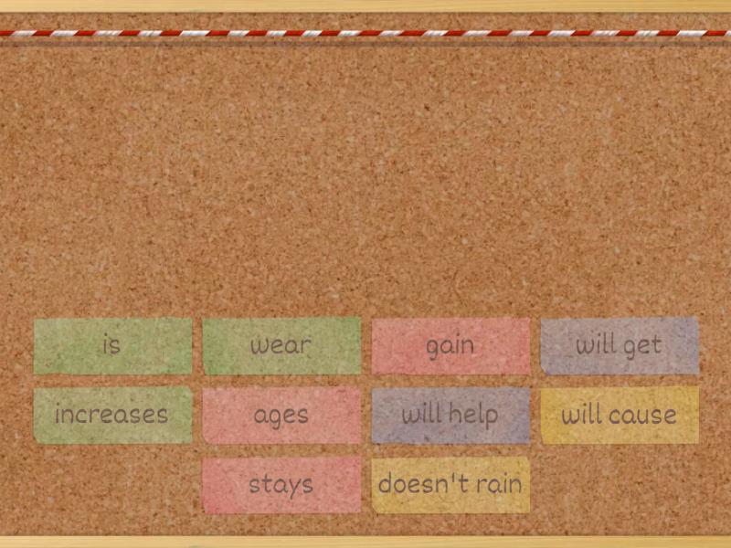 increases - I won't go the doctor unless the pain, stays - We will go for a picnic tomorrow if the weather ________nice., will help - I _______ you with the dishes if you are tired., doesn't rain - If it _______ plants don't grow., wear - I always ________ a jacket when it is cold., gain - If you eat fast food, you _______weight., will get - If we hurry, we _________ there on time., will cause - You ___________ an accident if you drive carelessly., is - If the baby _______ a boy, I will call him Jonathan., ages - If you smoke, your skin _________ more quickly.,