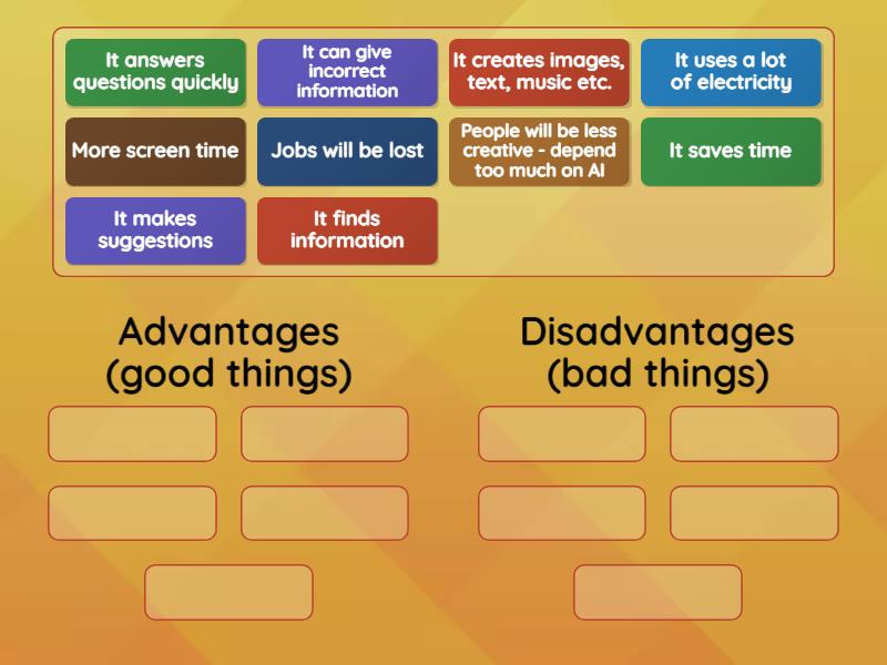 Advantages (good things): It saves time, It answers questions quickly, It makes suggestions, It finds information, It creates images, text, music etc., Disadvantages (bad things): It uses a lot of electricity, It can give incorrect information, More screen time, Jobs will be lost, People will be less creative - depend too much on AI,
