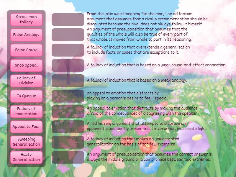 Appeal to Fear - An appeal to emotion that distracts by making the audience afraid of the consequences of disagreeing with the speaker, Snob appeal - an appeal to emotion that distracts by playing on a person's desire to feel "special.", Tu Quoque - From the latin word meaning "to the man," an ad fantom argument that assumes that a rival's recommendation should be discounted because the rival does not always follow it himself., Straw man fallacy - A red herring argument that attempts to disprove an opponent's position by presenting it in an unfair, inaccurate light., Fallacy of moderation - An argument of presupposition that assumes the correct answer is always the middle ground or a compromise between two extremes., Fallacy of Division - An argument of presupposition that assumes that the qualities of the whole will also be true of every part of that whole. It moves from whole to part in its reasoning., Hasty Generalization - A fallacy of induction that makes an unwarranted generalization on the basis of too few examples, Sweeping Generalization - A fallacy of induction that overextends a generalization to include facts or cases that are exceptions to it., False Analogy - A fallacy of induction that is based on a weak analogy., False Cause - A fallacy of induction that is based on a weak cause-and-effect connection.,