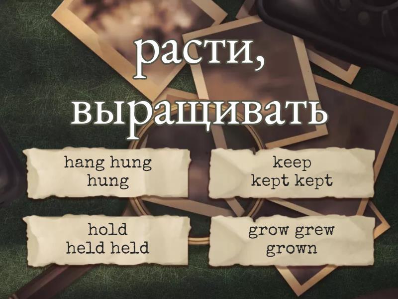 1) расти, выращивать a) hang hung hung b) keep kept kept c) hold held held d) grow grew grown 2) вешать, висеть a) keep kept kept b) lay laid laid c) hang hung hung d) hear heard heard 3) иметь a) lay laid laid b) have had had c) hold held held d) hear heard heard 4) слышать a) hear heard heard b) know knew known c) have had had d) lend lent lent 5) держать a) hold held held b) have had had c) lead led led d) hear heard heard 6) хранить, держать a) lay laid laid b) grow grew grown c) keep kept kept d) hang hung hung 7) знать a) know knew known b) keep kept kept c) have had had d) hang hung hung 8) класть a) hang hung hung b) lay laid laid c) have had had d) grow grew grown 9) вести (лидировать) a) lend lent lent b) lead led led c) hang hung hung d) have had had 10) давать взаймы, одолжить a) keep kept kept b) lend lent lent c) lead led led d) hear heard heard