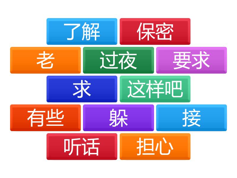 担心 - dānxīn, 求 - qiú, 这样吧 - zhèyàngba, 接 - jiē, 老 - lǎo, 听话 - tīnghuà, 要求 - yāoqiú, 过夜 - guòyè, 有些 - yǒuxiē, 保密 - bǎomì, 躲 - duǒ, 了解 - liǎojiě,