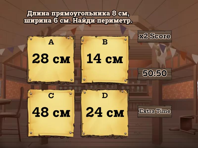 1) Длина прямоугольника 8 см, ширина 6 см. Найди периметр. a) 28 см b) 14 см c) 48 см d) 24 см 2) Одна сторона треугольника 5 см, другая – 8 см, а третья – 4 см. Чему равен периметр треугольника? a) 34 см b) 16 см c) 17 см d) 19 см 3) Длина прямоугольника 12 см, ширина – на 3 см короче. Найди периметр. a) 54 см b) 42 см c) 21 см d) 27 см 4) Одна сторона прямоугольника равна 5 см, другая – на 10 см длиннее. Найди его периметр. a) 40 см b) 30 см c) 20 см 5) Периметр квадрата равен 24 см. Чему равна его сторона? a) 12 см b) 96 см c) 6 см d) 48 см