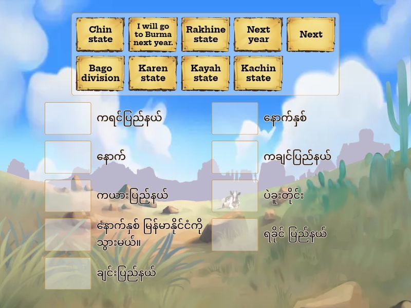 Political Division in Burma - တိုင်း (တိုင်းဒေသကြီး), Yangon division - ရန်ကုန်တိုင်း, Bago division - ပဲခူးတိုင်း, Sagaing division - စစ်ကိုင်းတိုင်း, Irrawaddy division - ဧရာဝတီတိုင်း, State - ပြည်နယ်, To surround - ဝိုင်းရံ, Coastal Strip - ကမ်းရိုးတန်း, Region - ဒေသ, Rakhine state - ရခိုင် ပြည်နယ်, Chin state - ချင်းပြည်နယ်, Kachin state - ကချင်ပြည်နယ်, Shan state - ရှမ်း ပြည်နယ်, Karen state - ကရင်ပြည်နယ်, Kayah state - ကယားပြည်နယ်, Mon state - မွန်ပြည်နယ်, How many division Burma has? - မြန်မာနိုင်ငံမှာ တိုင်း ဘယ်နှစ်တိုင်း ရှိသလဲ။, How many states Burma has? - မြန်မာနိုင်ငံမှာ ပြည်နယ် ဘယ်နှစ်ခု ရှိသလဲ။, Is Burma beautiful? - မြန်မာနိုင်ငံက လှသလား။, In my opinion - ကျွန်မ အထင်, How do you think? - ဘယ်လို ထင်သလဲ။, When will you go to Burma? - ဘယ်တော့ မြန်မာနိုင်ငံကို သွားမလဲ။, I will go to Burma next year. - နောက်နှစ် မြန်မာနိုင်ငံကို သွားမယ်။, Next year - နောက်နှစ်, Next - နောက်,