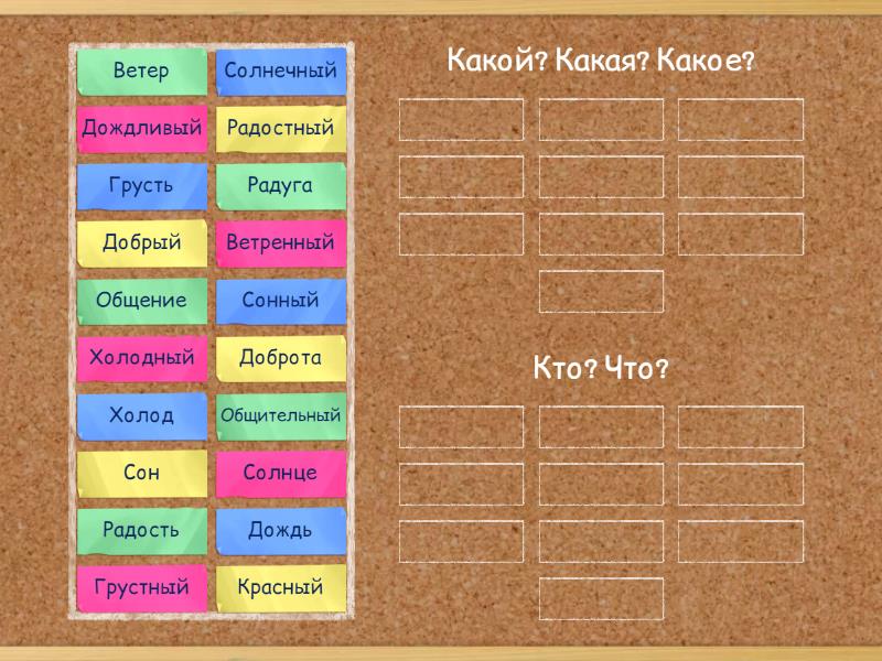 Какой? Какая? Какое?:  Солнечный, Сонный, Ветренный, Дождливый, Холодный, Красный, Радостный, Грустный, Добрый, Общительный, Кто? Что?: Солнце, Сон, Ветер, Дождь, Холод, Радуга, Радость, Грусть, Доброта, Общение,