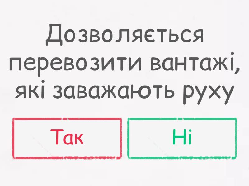 1) Дозволяється перевозити вантажі, які заважають руху a) Так b) Ні 2) Перед поїздкою не треба перевіряти гальма a) Так b) Ні 3) Пасажир велосипеда може сидіти на рамі a) Так b) Ні 4) Велосипедист є повноцінним учасником дорожнього руху a) Так b) Ні 5) Велорукавички захищають долоні та пальці під час падіння a) Так b) Ні 6) По проїзній частині дороги можна їздити велосипедом з 12 років a) Так b) Ні 7) Під час руху заборонено триматись за інший транспортний засіб a) Так b) Ні 8) Під час руху велосипедисту дозволено розмовляти по телефону a) Так b) Ні 9) Можна їздити на велосипеді в довгій спідниці a) Так b) Ні