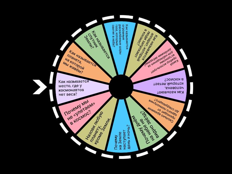 1) Как называется планета, на которой мы живём? 2) Как называется спутник Земли? 3) Как называются огромные раскалённые шары газа, которые светят в небе? 4) Как называется аппарат, который люди запускают в космос? 5) Какой прибор используют астрономы для наблюдения за далёкими звёздами? 6) Как называют человека, который летает в космос? 7) Сколько времени проходит от одного полнолуния до следующего? 8) Почему днём на небе не видно звёзд? 9) Почему на Земле наступает день и ночь? 10) Назови любую планету, кроме Земли. 11) Почему мы не «улетаем» в космос? 12) Как называется место, где у космонавтов нет веса?