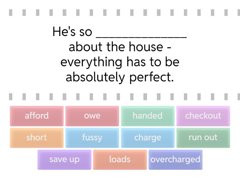 fussy - He's so ______________ about the house - everything has to be absolutely perfect., owe - I ______________ you a drink for helping me move., short - I’m a little ______________ of cash right now, so I can’t lend you anything., run out - I've ______________of milk/money/ideas/patience., checkout - She works on the ______________ at the local supermarket., overcharged - The shop ______________ me by €5., handed - The waiter smiled politely as he ______________ me my bill/handed my bill to me., loads - There were ______________ of people standing around a TV set in the store., save up - It took me months to ______________ enough money to go travelling., charge - They ______________ you $20 just to get in the nightclub., afford - I don't know how he can ______________ a new car on his salary.,