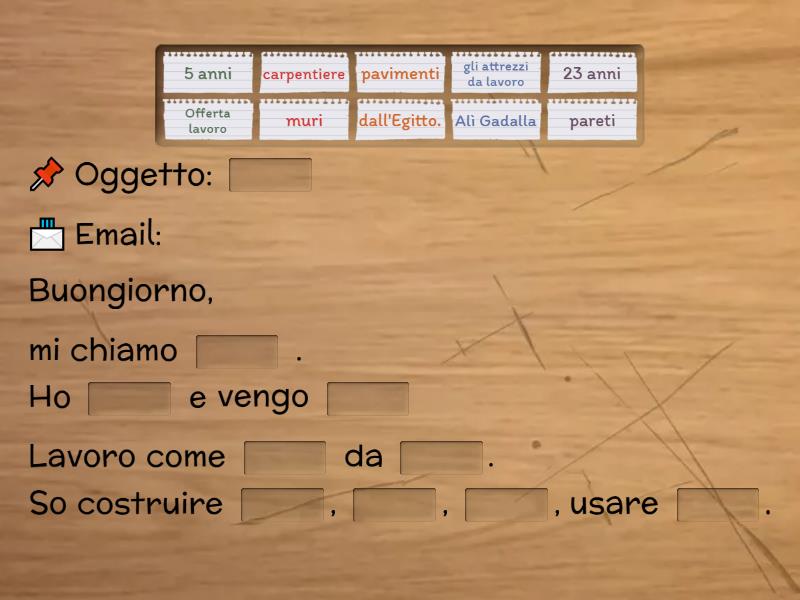 📌 Oggetto: ____ 📨 Email: Buongiorno, mi chiamo ____ . Ho ____ e vengo ____ Lavoro come ____ da ____. So costruire ____, ____, ____, usare ____. Sono interessato al ____ come ____. Sono disponibile per un ____. Grazie, aspetto una tua ____. Lascio i miei ____:  ____: 329123456  ____: aligadalla@gmail.com Alì Gadalla