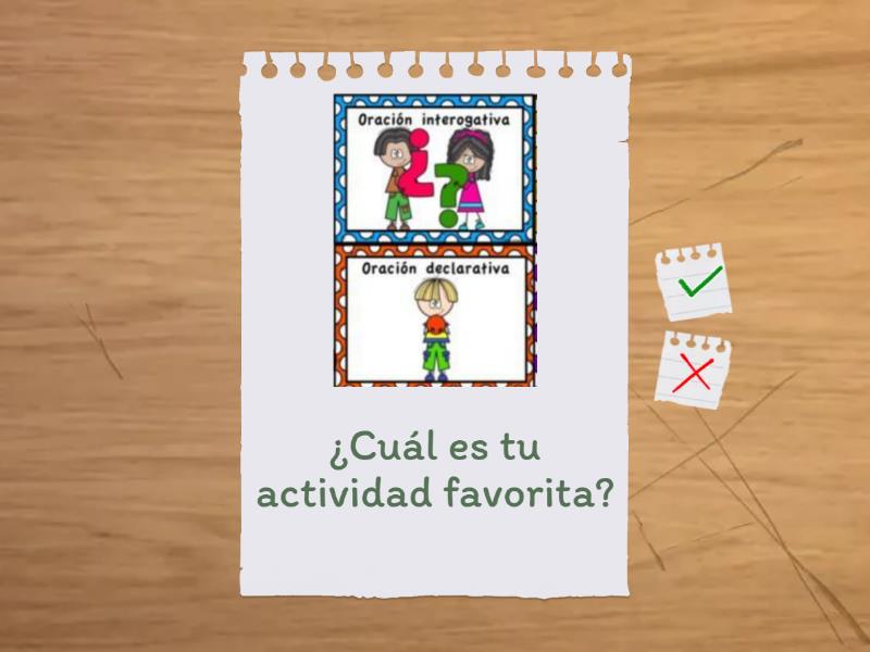 ¿Cómo te sientes hoy? - interrogativa, El sol es amarillo. - declarativa, Me gusta mi escuela. - declarativa, ¿Cuál es tu mascota favorita? - interrogativa, ¿Dónde puedo encontrar el libro? - interrogativa, Mi mejor amigo se llama Erik. - declarativa, Yo tengo 7 años. - declarativa, Ella tiene cuatro estrellas. - declarativa, ¿Cuál es tu actividad favorita? - interrogativa, ¿Por qué llueve hoy? - interrogativa,
