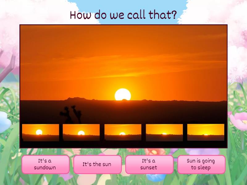 1) How do we call that? a) It's a sundown b) It's the sun c) It's a sunset d) Sun is going to sleep 2) " to know somebody/something really well" a) to know smth/smb like the back of your hand b) to know smth/smb like your palm c) to know smth/smb like your five fingers d) to know smth/smb like yourself 3) "обитатель, житель" a) citizen b) inhabitant c) inhabit d) native 4) What do we call this place? a) It's a mountain b) It's a cliff c) It's a valley d) It's a rock 5) "долговременный, постоянный" a) permanent b) lasting for long c) ever d) concrete 6) "to feel comfortable and relaxed" a) help yourself b) feel homie c) feel at your motherland d) feel at home 7) How would you characterize this road? a) It's a low road. b) It's a flat road. c) It's a steep road. d) It's a strict road. 8) He deсided to.... of his old things and trew them away. a) removed b) to get rid c) delete d) run to 9) She is a... a) nice woman b) organized person c) hoarder d) homeless 10) " чистота и порядок, чисто и опрятно" a) not durty b) well arranged c) spring cleaned d) neat and tidy 11) This place is full of... a) herbs b) plants c) greenery d) trees 12) "not bordering an ocean" a) on the land b) inland c) mainland d) outland 13) This fridge..... products a) get rid of b) runs out of c) full of d) has lots of 14) What is this? a) It's reed b) It's read c) It's stick d) It's rid 15) " располагаться, чувствовать себя как дома" a) relax b) make yourself at home c) feel free d) help yourself 16) "an area that is a part of a continent" a) inland b) outland c) mainland d) land 17) "to look for something everywhere because you've lost it" a) search all over the place b) look all over the place c) search over the place d) find all over the place 18) "made or produced by human being" a) artificial b) genuine c) neutral d) unreal 19) They are ... a) happy and amuzed b) trying not to kill each other c) listening to music d) packed in like sardines 20) "a long distance from other houses or a town" a) miles from home b) miles from anywhere c) miles abroad d) miles from town 21) "остепениться, осесть" a) settle down b) start a family c) drop down d) make a family 22) "directing one's hopes or ambitions towards becoming a specified type of person" a) one to make b) aspiring c) enthusiastic d) peak 23) What is it? a) It's a channel b) It's a canal c) It's a waterway d) It's a cliff 24) What is it? a) ferry b) yacht c) ship d) Titanic 25) "маршрут, путь" a) trip b) road c) trail d) way 26) "освободить место, потесниться" a) to clear the way b) to do room c) to clean room d) to make room 27) Synonym to "cooperative" a) not shared b) communal c) common d) united 28) to give ...the energy a) on b) at c) off d) in 29) Where is this place? a) It's in the suburb b) It's in the middle of the city c) It's in the city d) It's out of the city 30) "вид, природа" a) scenery b) countryside c) surrounding d) landscape