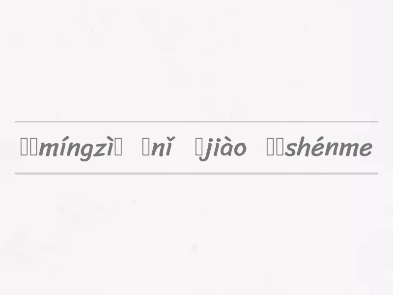 你nǐ 叫jiào 什么shénme 名字míngzì?  , 我wǒ 叫jiào Ali。, 她tā 叫jiào 什么shénme 名字míngzì?, 他tā 叫jiào 什么shénme 名字míngzì?, 他tā 叫jiào 什么shénme hanssan。, 她tā 叫jiào 什么shénme  mariam。,
