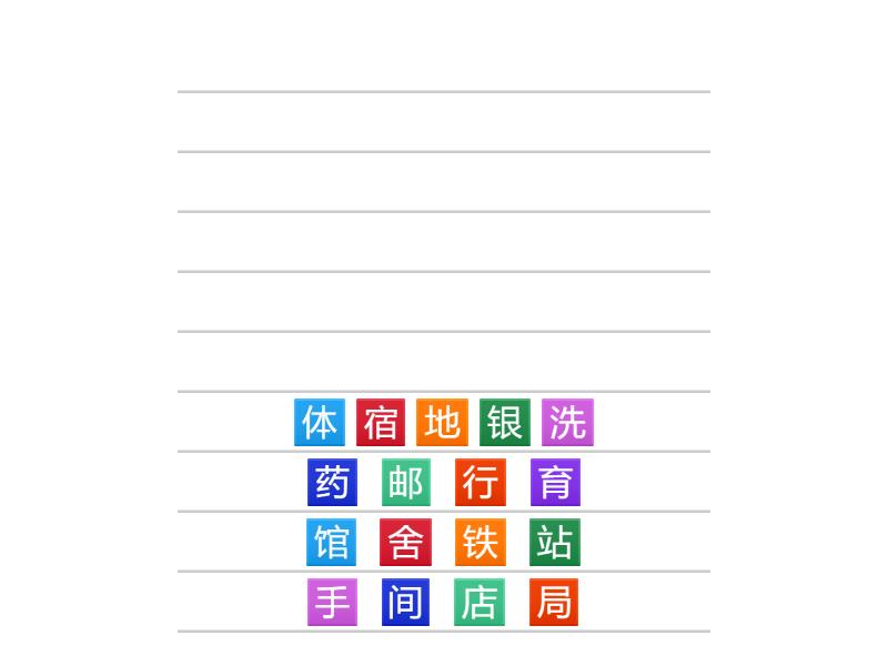 体, 宿, 地, 银, 洗, 药, 邮, 行, 育, 馆, 舍, 铁, 站, 手, 间, 店, 局.