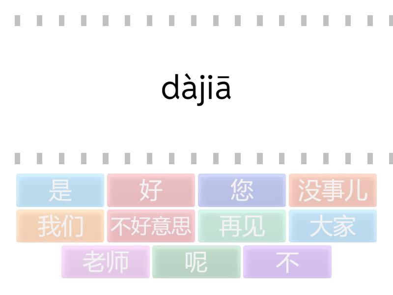 大家 - dàjiā , 好 - hǎo , 我们 - wǒmen , 呢 - ne , 老师 - lǎoshī , 您 - nín , 再见 - zàijiàn , 没事儿 - méishìr , 不 - bù , 是 - shì , 不好意思 - bùhǎoyìsi ,