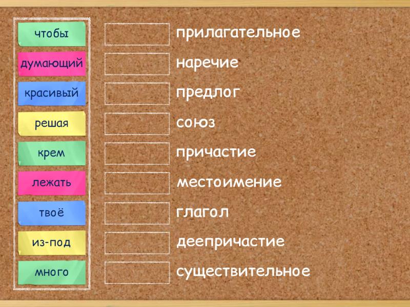 лежать - глагол, думающий - причастие, крем - существительное, красивый - прилагательное, много - наречие, из-под - предлог, решая - деепричастие, твоё - местоимение, чтобы - союз,