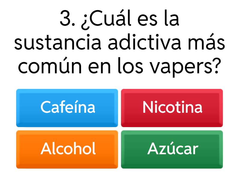 1) 3. ¿Cuál es la sustancia adictiva más común en los vapers? a) Cafeína b) Nicotina c) Alcohol d) Azúcar