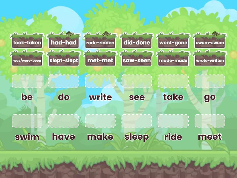 took-taken - take, went-gone - go, had-had - have, did-done - do, was/were-been - be, saw-seen - see, slept-slept - sleep, wrote-written - write, swam-swum - swim, made-made - make, met-met - meet, rode-ridden - ride,