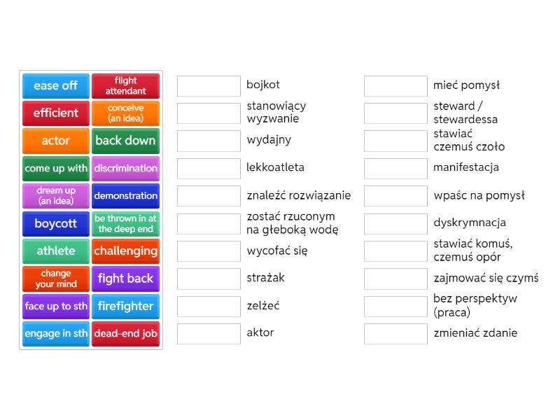 actor - aktor, athlete - lekkoatleta, back down - wycofać się, be thrown in at the deep end - zostać rzuconym na głeboką wodę, boycott - bojkot, challenging - stanowiący wyzwanie, change your mind - zmieniać zdanie, come up with - znaleźć rozwiązanie, conceive (an idea) - mieć pomysł, dead-end job - bez perspektyw (praca), demonstration - manifestacja, discrimination - dyskrymnacja, dream up (an idea) - wpaśc na pomysł, ease off - zelżeć, efficient - wydajny, engage in sth - zajmować się czymś, face up to sth - stawiać czemuś czoło, fight back - stawiać komuś, czemuś opór, firefighter - strażak, flight attendant - steward / stewardessa,