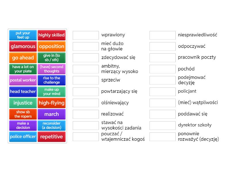 give in (to sb / sth) - poddawać się, glamorous - olśniewający, go ahead - realizować, have a lot on your plate - mieć dużo na głowie, head teacher - dyrektor szkoły, high-flying - ambitny, mierzący wysoko, highly skilled - wprawiony, injustice - niesprawiedliwość, make a decision - podejmować decyzję, make up your mind - zdecydować się, march - pochód, opposition - sprzeciw, police officer - policjant, postal worker - pracownik poczty, put your feet up - odpoczywać, reconsider (a decision) - ponownie rozważyć (decyzję), repetitive - powtarzający się, rise to the challenge - stawać na wysokości zadania, (have) second thoughts - (mieć) wątpliwości, show sb the ropers - pouczać / wtajemniczać kogoś,