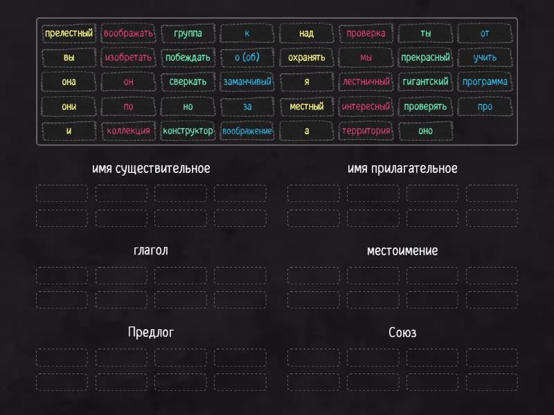 имя существительное: группа, конструктор, территория, коллекция, программа, воображение, проверка, имя прилагательное: прекрасный, лестничный, местный, интересный, гигантский, прелестный, заманчивый, глагол: охранять, сверкать, изобретать, учить, побеждать, воображать, проверять, местоимение: я, мы, ты, вы, она, он, оно, они, Предлог: по, за, над, к, о (об), от, про, Союз: и, а, но,