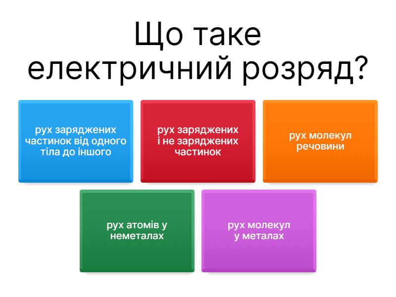 1) Що таке електричний розряд? a) рух заряджених частинок від одного тіла до іншого b) рух заряджених і не заряджених частинок c) рух молекул речовини d) рух атомів у неметалах e) рух молекул у металах 2) Що таке блискавка? a) фізичне тіло b) природне тіло c) електричний розряд d) світловий потік e) рух молекул світла 3) Що таке провідники? a) матеріали, які зберігають тепло. b) речовини, які відбивають світло c) речовини, які погано проводять електричний заряд d) речовини, які добре проводять електричний заряд. e) речовини, які розчиняються у воді 4) Від чого захищають нас ізолятори? a) від електричного розряду b) від теплового удару c) від хвороб та інфекцій d) від впливу сонячного світла e) від потрапляння води