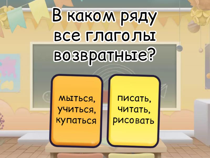 1) В каком ряду все глаголы возвратные? a) мыться, учиться, купаться b) писать, читать, рисовать 2) Какой тип возвратного глагола в слове обниматься? a) действие на самого себя b) взаимное действие 3) Определи, какой глагол не возвратный: a) бояться b) смотреть 4) Вставь пропущенное слово. Мне не _____ (спать) ночью a) спится b) уснуть 5) Какой признак отличает возвратные глаголы? a) Они оканчиваются на -ся / -сь b) Образуются только от существительных