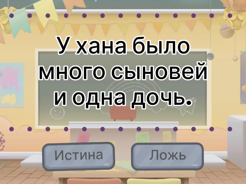 Истина: У хана было много сыновей и одна дочь., Высота Жумбактас 18 метров., Братья превратили сестру в скалу-загадку Жумбактас., Джигит был не богат., Хан не хотел отдать дочь за бедного джигита., "Камень-загадка Жумбактас" - это казахская легенда., У произведения нет конкретного автора., Влюблённые сбежали в Бурабай., Молодые, оставшись одни, катались на лодке по заливу., Братья поразили джигита стрелой., Ложь: У хана было много красивых дочерей и один сын., Высота Жумбактас 81 метр., Отец превратил дочь в скалу-загадку Жумбактас., У джигита было много лошадей., Хан отдал дочь замуж за бая., "Камень-загадка Жумбактас" - это казахский эпос., Произведение написал Абая Кунанбаев., Влюблённые сбежали в Астану., Молодые, оставшись одни, катались на большом корабле., Братья забрали сестру домой и она вышла замуж за богатого бия.,