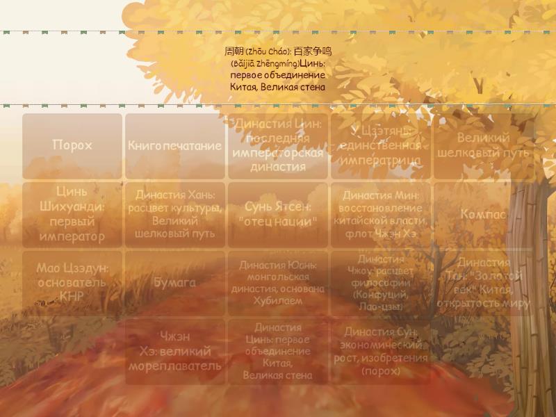 Династия Чжоу: расцвет философии (Конфуций, Лао-цзы) - 周朝 (Zhōu Cháo): 百家争鸣 (Bǎijiā Zhēngmíng)Цинь: первое объединение Китая, Великая стена, Династия Цинь: первое объединение Китая, Великая стена - 秦朝 (Qín Cháo): 统一中国, 修建长城, Династия Хань: расцвет культуры, Великий шелковый путь - 汉朝 (Hàn Cháo): 文化繁荣, 丝绸之路 (Sīchóu Zhī Lù), Династия Тан: "Золотой век" Китая, открытость миру - 唐朝 (Táng Cháo): 盛世, 开放, Династия Сун: экономический рост, изобретения (порох) - 宋朝 (Sòng Cháo): 经济发达, 发明火药, Династия Юань: монгольская династия, основана Хубилаем - 元朝 (Yuán Cháo): 蒙古族统治, 忽必烈建立, Династия Мин: восстановление китайской власти, флот Чжэн Хэ - 明朝 (Míng Cháo): 恢复汉族统治, 郑和下西洋, Династия Цин: последняя императорская династия - 清朝 (Qīng Cháo): 最后一个封建王朝, Цинь Шихуанди: первый император - 秦始皇 (Qín Shǐhuáng), У Цзэтянь: единственная императрица - 武则天 (Wǔ Zétiān), Чжэн Хэ: великий мореплаватель - 郑和 (Zhèng Hé), Сунь Ятсен: "отец нации" - 孙中山 (Sūn Zhōngshān), Мао Цзэдун: основатель КНР - 毛泽东 (Máo Zédōng), Бумага - 造纸术 (Zàozhǐ shù), Книгопечатание - 印刷术 (Yìnshuā shù), Порох - 火药 (Huǒyào), Компас - 指南针 (Zhǐnánzhēn), Великий шелковый путь - 丝绸之路 (Sīchóu Zhī Lù),