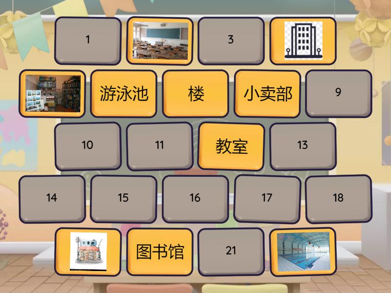 图书馆, 游泳池, 教室, 楼, 小卖部, 操场, 体育馆, 礼堂, 美术室, 音乐室, 停车场,