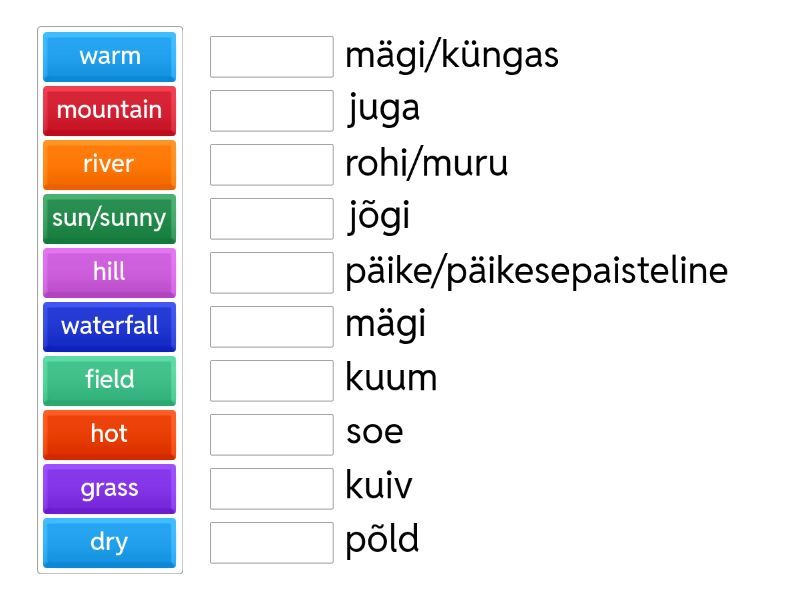 beach - rand, field - põld, flowers - lilled, forest - mets, grass - rohi/muru, hill - mägi/küngas, island - saar, lake - järv, mountain - mägi, ocean - ookean, plants - taimed, river - jõgi, sky - taevas, valley - org, waterfall - juga, cloud/cloudy - pilv/pilvine, cold - külm, dry - kuiv, fog/foggy - udu/udune, hot - kuum, ice/icy - jää/jäine, rain/rainy - vihm/vihmane, snow/snowy - lumi/lumine, storm/stormy - torm/tormine, sun/sunny - päike/päikesepaisteline, warm - soe, wet - märg, wind/windy - tuul/tuuline,