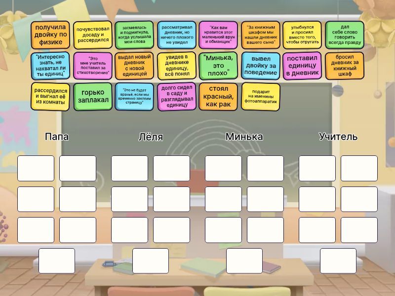 Папа: "Интересно знать, не нахватал ли ты единиц", увидев в дневнике единицу, всё понял, рассматривал дневник, но ничего плохого не увидел, улыбнулся и просиял вместо того, чтобы отругать, рассердился и выгнал её из комнаты, подарит на именины фотоаппаратик, Лёля: "Минька, это плохо", получила двойку по физике, "Это не будет враньё, если мы временно заклеим страницу", засмеялась и подмигнула, когда услышала мои слова, Минька: "Это мне учитель поставил за стихотворение", бросил дневник за книжный шкаф, горько заплакал, дал себе слово говорить всегда правду, долго сидел в саду и разглядывал единицу, почувствовал досаду и рассердился, стоял красный, как рак, Учитель: вывел двойку за поведение, "За книжным шкафом мы нашли дневник вашего сына", выдал новый дневник с новой единицей, "Как вам нравится этот маленький врун и обманщик", поставил единицу в дневник,
