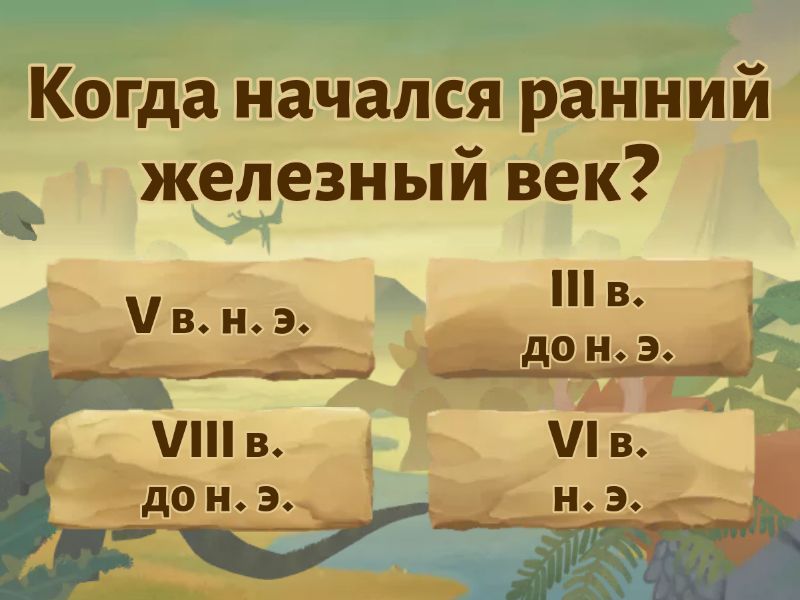 1) Когда начался ранний железный век? a) V в. н. э. b) III в. до н. э. c) VIII в. до н. э. d) VI в. н. э. 2) Что использовали для выплавки железа? a) Каменные печи b) Плавильные печи c) Глиняные сосуды d) Деревянные формы 3) Какой металл редко встречается в чистом виде? a) Железо b) Бронза c) Медь d) Золото 4) Что стало предпосылкой к образованию первых государств? a) Торговля b) Ювелирное искусство c) Военные набеги d) Племенные союзы 5) Какой металл использовали для конской упряжи? a) Железо b) Бронза c) Медь d) Серебро 6) Что помогало защищать земли от врагов? a) Деревянные щиты b) Каменные стены c) Железные орудия d) Бронзовые мечи 7) Какой стиль использовали ювелиры? a) Минимализм b) Классицизм c) Барокко d) Полихромный стиль 8) Что использовали для раздувания огня в печи? a) Веера b) Мехи c) Трубки d) Вентиляторы 9) Какой металл покрывали листовым золотом? a) Железо b) Медь c) Серебро d) Олово 10) Что стало основой для нового исторического этапа? a) Торговля b) Конская упряжь c) Ювелирные изделия d) Железные орудия