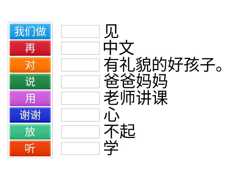 小朋友 - 讲礼貌。, 我们做 - 有礼貌的好孩子。, 用 - 心, 没 - 关系, 对 - 不起, 谢谢 - 爸爸妈妈, 请 - 上车, 再 - 见, 做 - 作zuo业ye, 记 - 笔记, 告 - 诉, 放 - 学, 今天是 - 星期四, 听 - 老师讲课, 说 - 中文, 下午 - 好,
