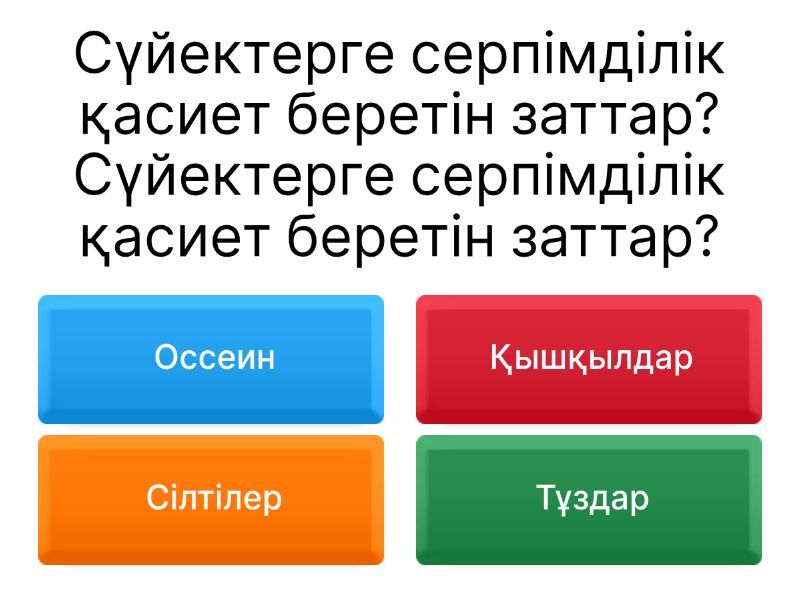 1) Сүйектерге серпімділік қасиет беретін заттар? Сүйектерге серпімділік қасиет беретін заттар? a) Оссеин  b)  Қышқылдар c) Сілтілер  d) Тұздар  2) Тұлға сүйектерін ата? a) Қабырға,төс, шынтақ сүйегі b) Омыртқа жотасы,төс,қабырғалар c) Ортан жілік,шыбық сүйегі, омыртқа жотасы d) Төс, бұғана, тоқпан жілік 3) Төс сүйегінің бөлімдерін ата? a) Тұтқасы, денесі, семсер тәрізді өсіндісі b) Ұршық өсіндісі,денесі,семсер тәрізді c) Басы, денесі,семсер тәрізді d) Бұдыры,басы, мойыны 4) Балтыр сүйектерінің аралығы немен толтырылған? a) Жарғақты шеміршек b) Бұлшық ет c) Борпылдақ тін d) Май 5) Жамбас сүйегі бірігіп кеткен үш сүйектен түзілген? a) Osparietale, osfrontale, osoccipitale b) Os ilium, os pubis, acetabulum c) Os ilium, os pubis, os ischii d) Columnavertebralis , osoccipitale, .os ilium 6) Анатомиялық және хирургиялық мойыны қандай сүйектерде кездеседі? a) Тоқпан жілікте b) Жауырында c) Жамбас сүйегінде d) Шынтақ жілікте 7) Қолдың жалпақ сүйектеріне қандай сүйектер жатады? a) жауырын b) Шүйде сүйегі c) Шеке сүйегі d) Жамбас сүйегі 8) Иық белдеуіне қандай сүйектер жатады? a) Бұғана, жауырын b) Тоқпан жілік, қол басы сүйектері c) Ортан жілік,шыбық сүйегі d) Шынтақ сүйегі, бұғана 9) Ұршық ойығы қандай сүйекте орналасқан? a) Жамбас сүйегінде b) Бұғанада c) Жауырында d) Тоқпан жілікте 10) Жауырынның өсінділерін ата? a) акромион b) Қосымша өсінді c) Бізтәрізді өсінді d) Тәждік өсінді 11) Шынтақ буыны құрылысы бойынша? a) Күрделі b) Үйлесімді c) Қарапайым d) Кешенді 12) Жауырынның жоғарғы 2/3 бөлігінде не орналасқан? a) Қыры b) Өсіндісі c) Буын беті d) Мойыны 13) Денесі жоқ омыртқаны ата? a) 1-ші мойын омыртқа  b) 7 мойын омыртқа c) сегізкөз d) 2 мойын омыртқа 14) Омыртқа жотасының алдыға қарай иілуі қалай аталады? a) лордоз b) скифоз c) скалиоз d) остеохандроз 15) Альвеолярлық өсінді қай сүйекте болады? a) астынғы жақ b) тандай c) шықшыт d) мандай 16) Үстіңгі жақтың неше өсіндісі бар? a) 4 b) 2 c) 6 d) 1  17) Мойын омыртқалардың көлденең өсіндісінде не орналасқан? a) тесік b) өсінді c) Сай d) жырық 18) Шынтақ буыны неше сүйектен құралған? a) 3 b) 4 c) 1 d) 5 19) Үлкен ұршық қандай сүйекте орналасқан? a) ортан жілік b) шыбық c) шынтақ d) төбе 20) Қабырғалар төске не арқылы байланысады? a) шеміршек b) бұлшық ет c) сіңір d) байлам 21) Жауырынның омыртқа жотасына қараған қыры қалай аталады? a) Медиальды b) латеральды c) жоғарғы d) төменгі 22) Бас сүйектерінің ішінде қозғалмалы сүйекті ата? a) Астынғы жақ  b) самай c) төбе d) мандай 23) Симфиз құрайтын сүйекті ата? a) шат сүйегі b) тор сүйегі c) сына тәрізді d) шонданай сүйегі 24) Сыртқы есту түтігі самай сүйегінің қай бөлігінде орналасқан? a) Дабыл b) Қабыршақты c) Тастай d) қатты бөлігінде 25) Оs patella қайда орналасқан? a) аяқта b) қолда c) баста d) жамбаста 26) Оs nasalis? a) мұрын сүйегі b) көз жас сүйегі c) тор сүйегі d) шүйде сүйегі 27) Емізік тәрізді өсінді қай сүйекте орналасқан? a) самай b) тор c) сына d) шүйде 28) Жамбас сүйегі неше жаста толық бірігеді? a) 14-16 b) 10-15 c) 30-35 d) 6-7 29) Жауырын сүйегі қай жаста толық сүйектенеді? a) 12-13 b) 10-15 c) 20-25 d) 18-24 30) Trochanter minor қай сүйекте орналасқан? a) ортан жілік b) жамбас c) тоқпан жілік d) жауырын 31) Шар тәрізді буынға қай буын жатады? a) Иық буыны b) Тізе буыны c) Білезікбуыны d) Шынтақбуыны 32) Диартроз дегеніміз: a) Үзілісті буын b) Үзіліссіз буын c) Жартылай үзілісті d) Жартылай үзіліссіз 33) Vertebra cervicalisis дегеніміз? a) Мойын омыртқалар b) Бел омыртқалар c) Сегізкөзомыртқалар d) Кеуде омыртқалар 34) Vertebra lumbalis дегеніміз? a) Бел омыртқалар b) Мойын омыртқалар c) Сегізкөзомыртқалар d) Кеуде омыртқалар 35) Os lacremale қай сүйек? a