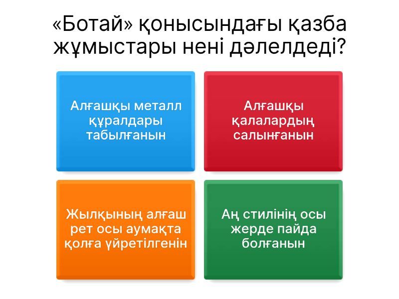 1) «Ботай» қонысындағы қазба жұмыстары нені дәлелдеді? a) Алғашқы металл құралдары табылғанын b) Алғашқы қалалардың салынғанын c) Жылқының алғаш рет осы аумақта қолға үйретілгенін d) Аң стилінің осы жерде пайда болғанын 2) Қазақстан аумағында ежелгі металлургияның дамуына не себеп болды? a) Металл кендеріне бай болуы b) Теңізге жақын орналасуы c) Мал шаруашылығының дамуы d) Қала мәдениетінің қалыптасуы 3) «Аң стилі» өнерінің басты идеясы қандай? a) Әскери қару-жарақты безендіру b) Жануар бейнесі арқылы адам мен табиғаттың байланысын көрсету c) Сәндік әшекей жасау d) Қала архитектурасын бейнелеу 4) «Алтын адам» қай жерден табылды? a) Берел қорымынан b) Түркістан қаласынан c) Ботай қонысынан d) Есік қорғанынан 5) Қазақстанның қандай аумағы алма мен қызғалдақтың тарихи отаны саналады? a) Алатау баурайы b) Сарыарқа жазығы c) Маңғыстау өңірі d) Алтай тауының бөктері
